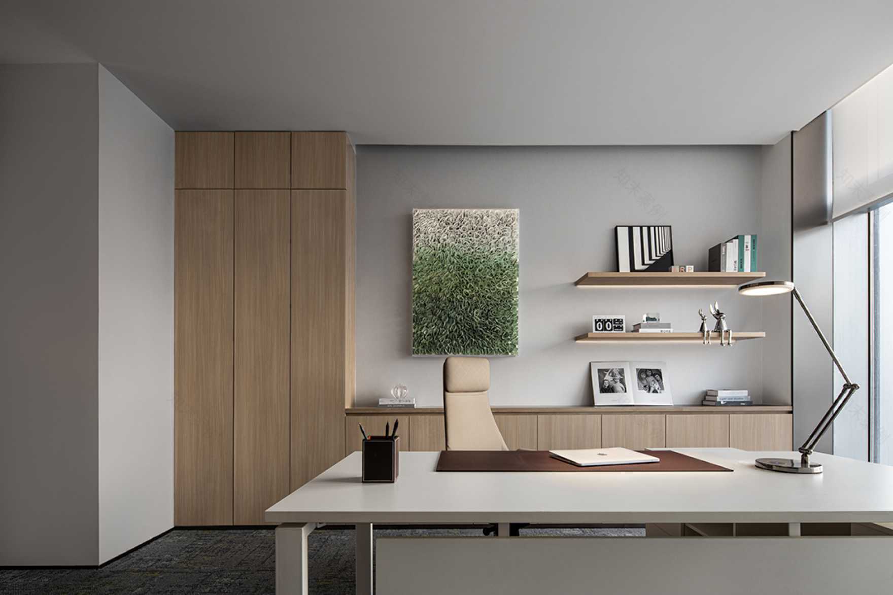 • 總裁辦公室:實(shí)木護(hù)墻板+智能霧化玻璃(2000元/㎡起)